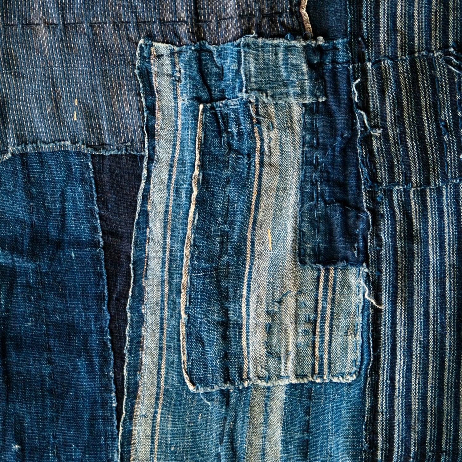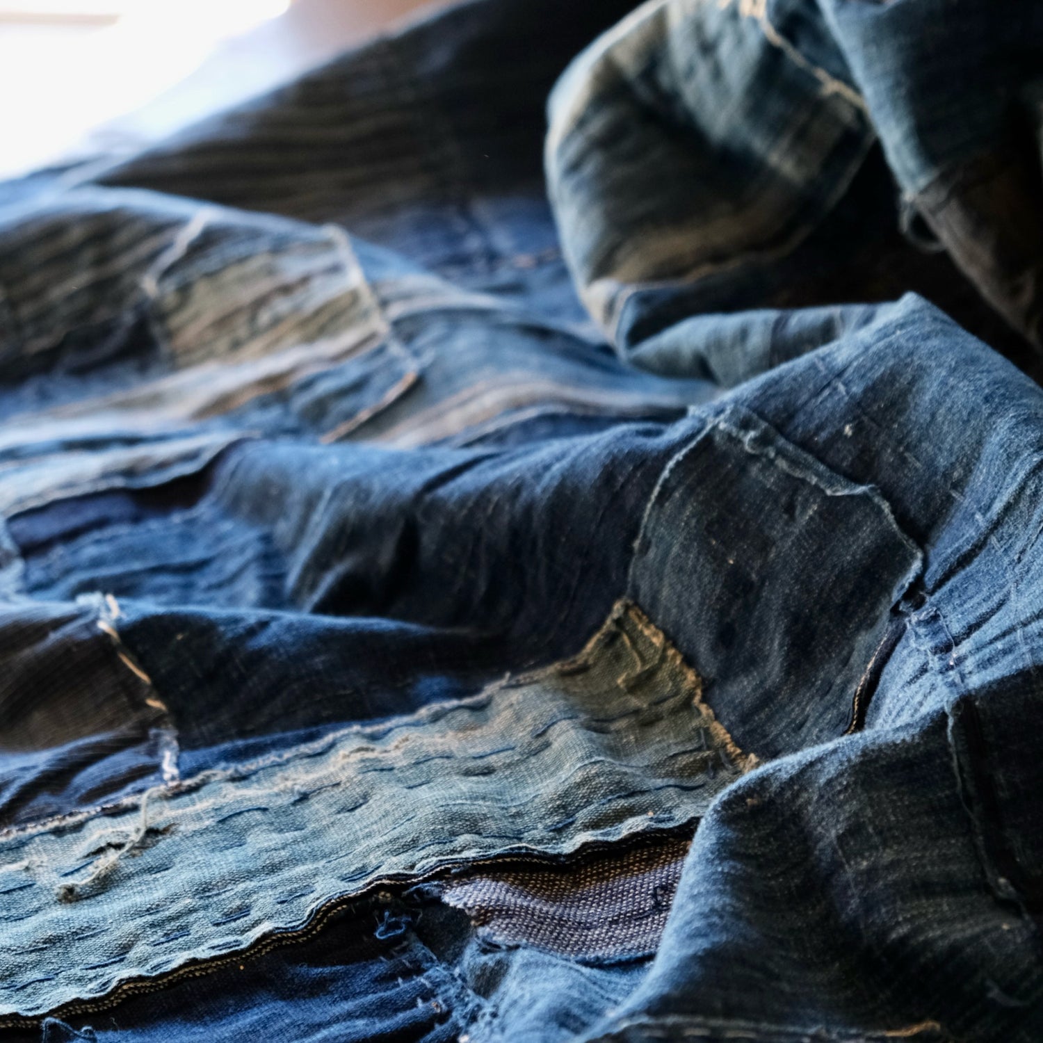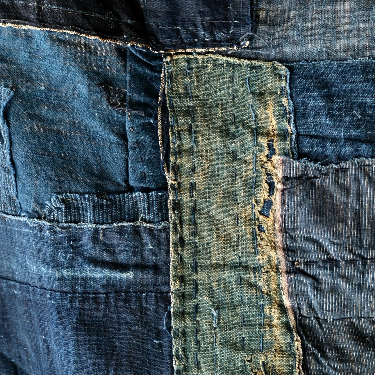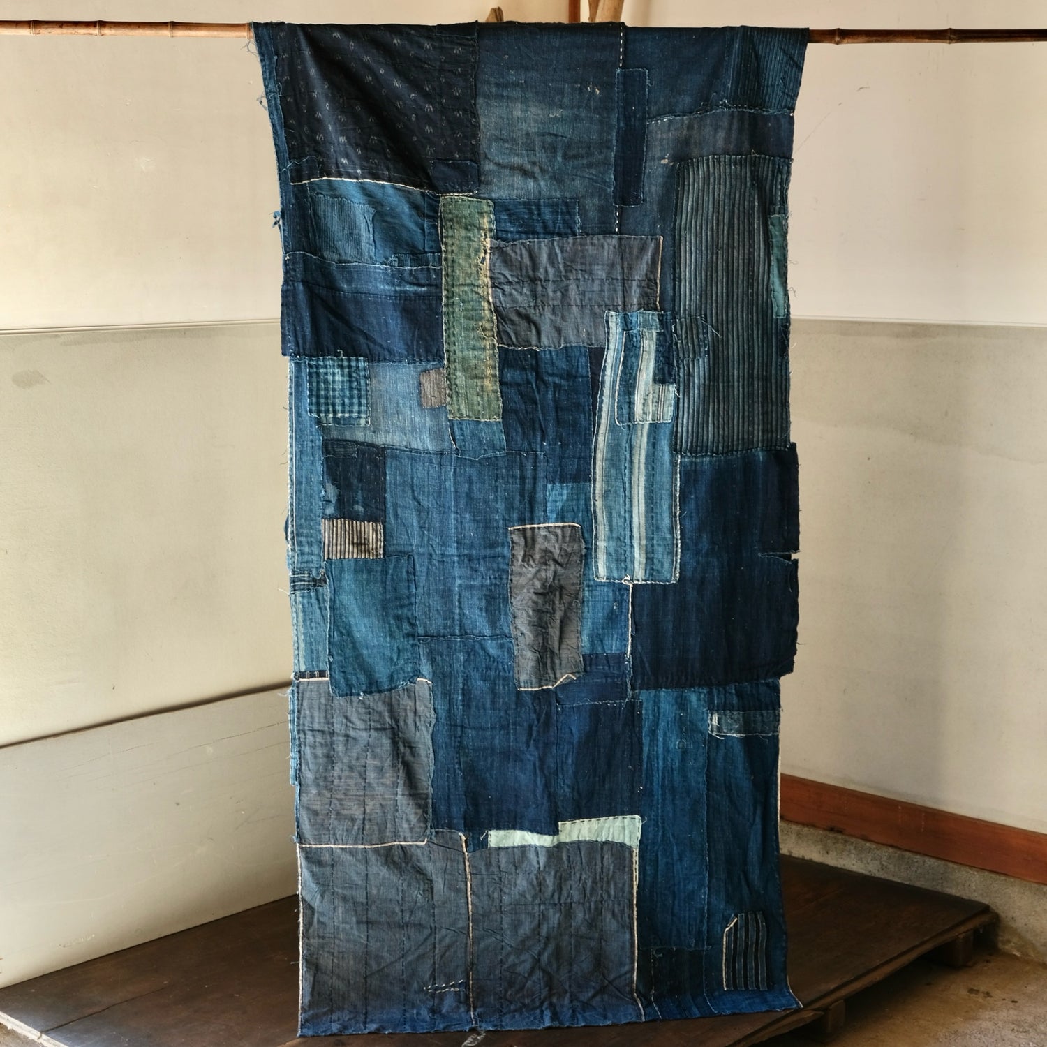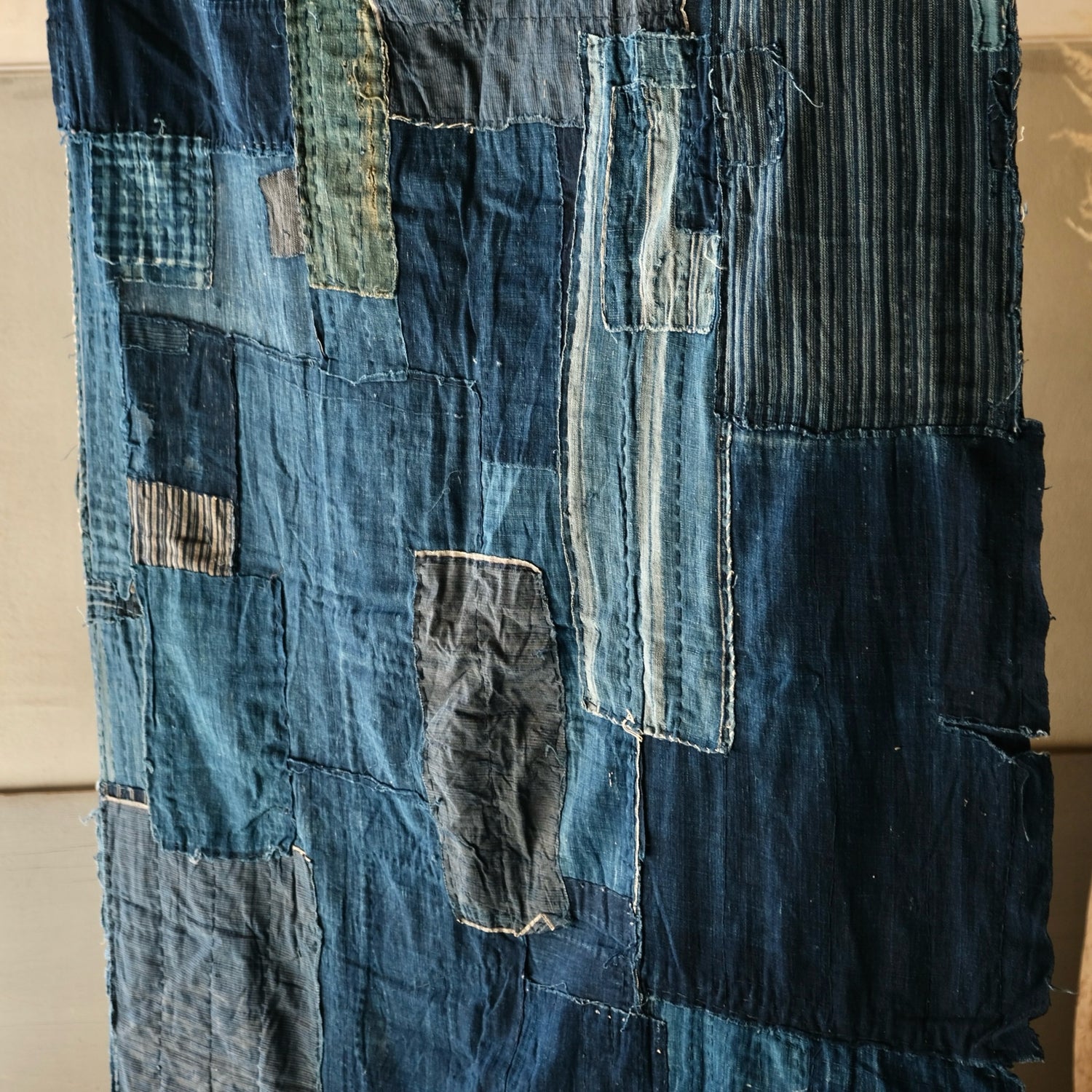 Small fabrics were stitched together with Sashiko stitching. It has been used and washed for a long time, so it has a soft texture and a beautiful faded color.