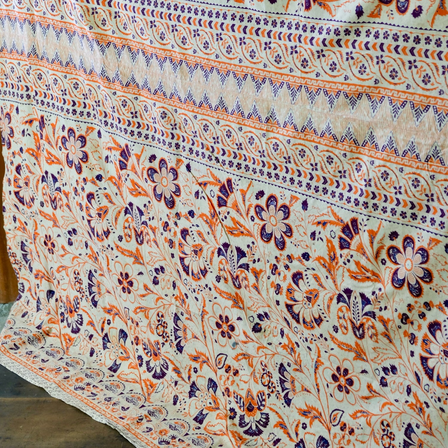 Massive Vintage Japanese Sarasa Calico Cotton Textile - Oriental Floral & Bird Pattern in Orange and Purple - Rare Large Panel
